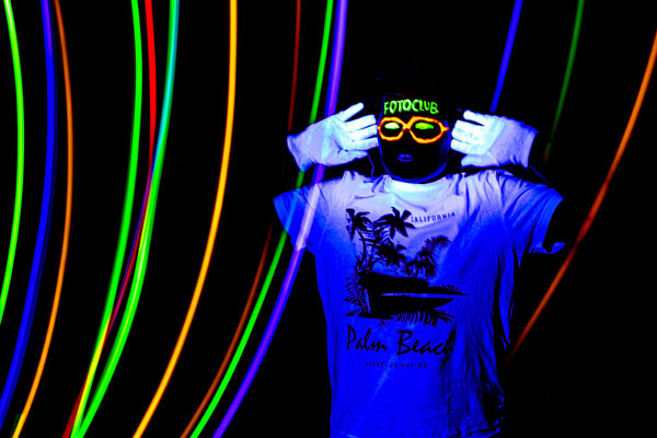 Mit Taschenlampen, bunten LEDs und Schwarzlicht verwandelte sich der abgedunkelte Clubraum in eine Bühne voller leuchtender Bilder. Unter Anleitung erfahrener Fotografen lernten die Teilnehmenden, wie man mit langen Belichtungszeiten und bewegten Lichtquellen kreative Effekte gestaltet – und das sogar mit dem Smartphone.
